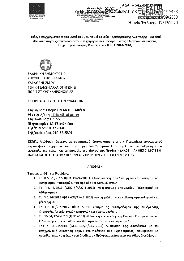 Απόφαση διενέργειας συνοπτικού διαγωνισμού για την Προμήθεια ανυψωτικού περονοφόρου οχήματος για το υποέργο Του Υποέργου 1: Παρεμβάσεις αναβάθμισης στον αρχαιολογικό χώρο και το μουσείο της Δήλου της Πράξης «ΔΗΛΟΣ - ΑΝΟΙΚΤΟ ΜΟΥΣΕΙΟ. ΠΑΡΕΜΒΑΣΕΙΣ ΑΝΑΒΑΘΜΙΣΗΣ ΣΤΟΝ ΑΡΧΑΙΟΛΟΓΙΚΟ ΧΩΡΟ ΚΑΙ ΤΟ ΜΟΥΣΕΙΟ».ΑΔΑ: Ψ5ΑΥ4653Π4-ΘΓΡ
