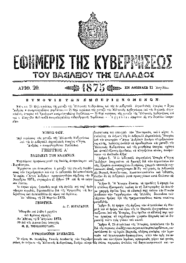 1. ΦΕΚ 20/A, 1875 http://www.et.gr/