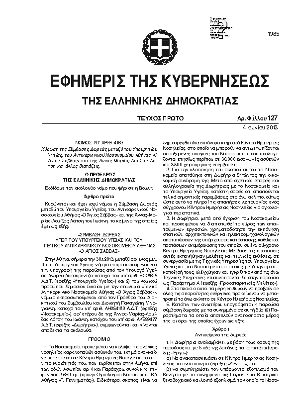 ΚΥΡΩΣΗ ΤΗΣ ΣΥΜΒΑΣΗΣ ΔΩΡΕΑΣ ΜΕΤΑΞΥ ΤΟΥ ΥΠΟΥΡΓΕΙΟΥ ΥΓΕΙΑΣ, ΤΟΥ ΑΝΤΙΚΑΡΚΙΝΙΚΟΥ ΝΟΣΟΚΟΜΕΙΟΥ ΑΘΗΝΑΣ «Ο ΑΓΙΟΣ ΣΑΒΒΑΣ» ΚΑΙ ΤΗΣ ΑΝΝΑΣ-ΜΑΡΙΑΣ-ΛΟΥΙΖΑΣ ΛΑΤΣΗ ΚΑΙ ΑΛΛΕΣ ΔΙΑΤΑΞΕΙΣ