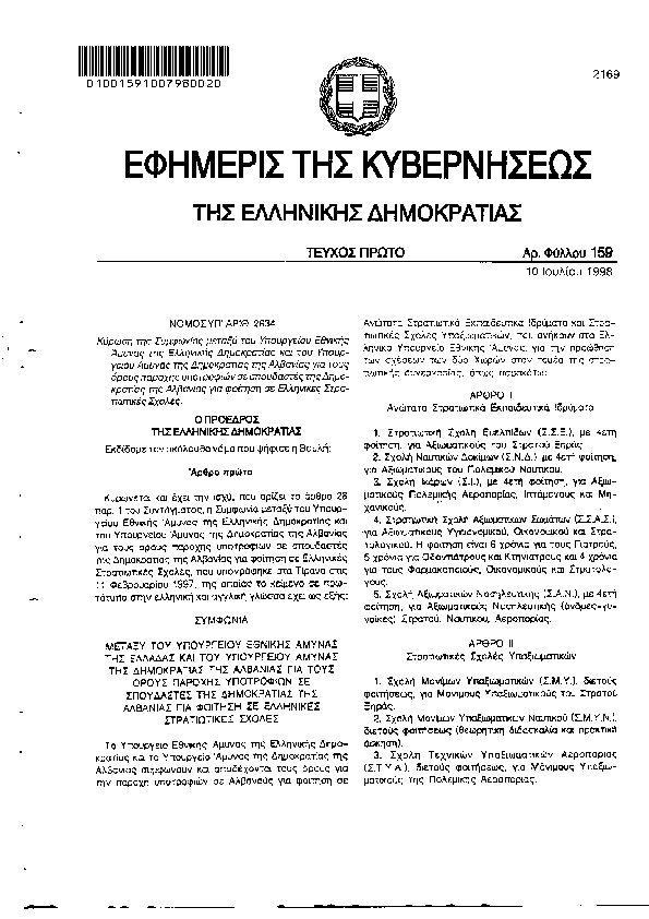 • ΚΥΡΩΣΗ ΤΗΣ ΣΥΜΦΩΝΙΑΣ ΜΕΤΑΞΥ ΤΟΥ ΥΠΟΥΡΓΕΙΟΥ ΕΘΝΙΚΗΣ ΑΜΥΝΑΣ ΤΗΣ ΕΛΛΗΝΙΚΗΣ ΔΗΜΟΚΡΑΤΙΑΣ ΚΑΙ ΤΟΥ ΥΠΟΥΡΓΕΙΟΥ ΑΜΥΝΑΣ ΤΗΣ ΔΗΜΟΚΡΑΤΙΑΣ ΤΗΣ ΑΛΒΑΝΙΑΣ ΓΙΑ ΤΟΥΣ ΟΡΟΥΣ ΠΑΡΟΧΗΣ ΥΠΟΤΡΟΦΙΩΝ ΣΕ ΣΠΟΥΔΑΣΤΕΣ ΤΗΣ ΔΗΜΟΚΡΑΤΙΑΣ ΤΗΣ ΑΛΒΑΝΙΑΣ ΓΙΑ ΦΟΙΤΗΣΗ ΣΕ ΕΛΛΗΝΙΚΕΣ ΣΤΡΑΤ/ΚΕ
