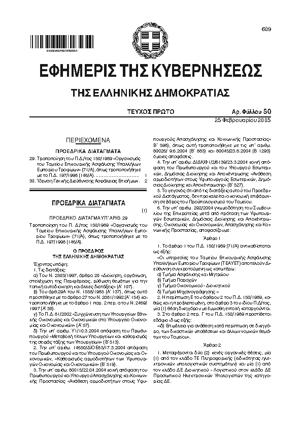 ΤΡΟΠΟΠΟΙΗΣΗ ΤΟΥ ΠΔ 150/1989 ΟΡΓΑΝΙΣΜΟΣ ΤΟΥ ΤΑΜΕΙΟΥ ΕΠΙΚΟΥΡΙΚΗΣ ΑΣΦΑΛΙΣΗΣ ΥΠΑΛΛΗΛΩΝ ΕΜΠΟΡΙΟΥ ΤΡΟΦΙΜΩΝ (71Α) ΟΠΩΣ ΤΡΟΠΟΠΟΙΗΘΗΚΕ ΜΕ ΤΟ ΠΔ 197/1998 (146/Α)