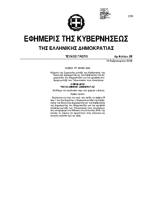 ΚΥΡΩΣΗ ΤΗΣ ΣΥΜΦΩΝΙΑΣ ΜΕΤΑΞΥ ΤΗΣ ΚΥΒΕΡΝΗΣΗΣ ΤΗΣ ΕΛΛΗΝΙΚΗΣ ΔΗΜΟΚΡΑΤΙΑΣ ΚΑΙ ΤΗΣ ΚΥΒΕΡΝΗΣΗΣ ΤΗΣ ΔΗΜΟΚΡΑΤΙΑΣ ΤΟΥ ΑΖΕΡΜΠΑΙΤΖΑΝ ΓΙΑ ΤΗΝ ΑΜΟΙΒΑΙΑ ΣΥΝΔΡΟΜΗ ΜΕΤΑΞΥ ΤΩΝ ΤΕΛΩΝΕΙΑΚΩΝ ΤΟΥΣ ΔΙΟΙΚΗΣΕΩΝ.