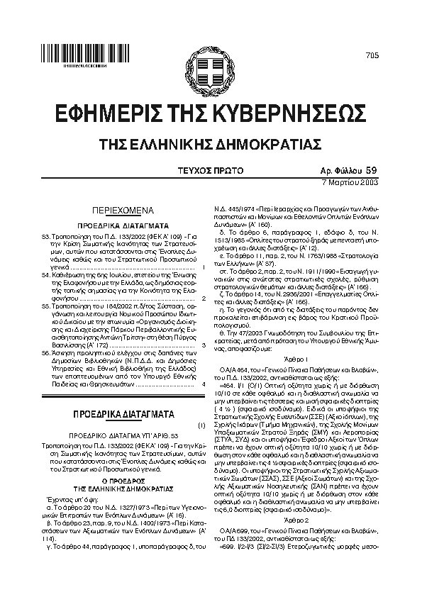 • ΤΡΟΠΟΠΟΙΗΣΗ ΤΟΥ ΠΔ 133/2002 (ΦΕΚ Α 109) ΓΙΑ ΤΗΝ ΚΡΙΣΗ ΣΩΜΑΤΙΚΗΣ ΙΚΑΝΟΤΗΤΑΣ ΤΩΝ ΣΤΡΑΤΕΥΣΙΜΩΝ ΑΥΤΩΝ ΠΟΥ ΚΑΤΑΤΑΣΣΟΝΤΑΙ ΣΤΙΣ ΕΝΟΠΛΕΣ ΔΥΝΑΜΕΙΣ ΚΑΘΩΣ ΚΑΙ ΤΟΥ ΣΤΡΑΤΙΩΤΙΚΟΥ ΠΡΟΣΩΠΙΚΟΥ ΓΕΝΙΚΑ