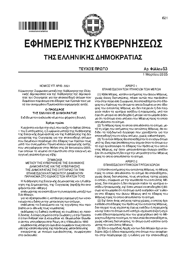 ΚΥΡΩΣΗ ΤΗ ΣΥΜΦΩΝΙΑΣ ΜΕΤΑΞΥ ΤΗΣ ΚΥΒΕΡΝΗΣΗΣ ΤΗΣ ΕΛΛΗΝΙΚΗΣ ΔΗΜΟΚΡΑΤΙΑΣ ΚΑΙ ΤΗΣ ΚΥΒΕΡΝΗΣΗΣ ΤΗΣ ΔΗΜΟΚΡΑΤΙΑΣ ΤΗΣ ΟΥΓΓΑΡΙΑΣ ΓΙΑ ΤΗΝ ΕΠΑΝΕΙΣΔΟΧΗ ΑΤΟΜΩΝ ΠΟΥ ΔΙΑΜΕΝΟΥΝ ΠΑΡΑΝΟΜΑ ΣΤΟ ΕΔΑΦΟΣ ΤΩΝ ΚΡΑΤΩΝ ΤΟΥΣ ΜΕΤΑ ΤΟΥ ΣΥΝΗΜΜΕΝΟΥ ΠΡΩΤΟΚΟΛΛΟΥ ΕΦΑΡΜΟΓΗΣ ΤΟΥΣ