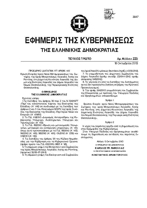 ΙΔΡΥΣΗ ΕΝΟΡΙΑΣ ΙΕΡΟΥ ΝΑΟΥ ΜΕΤΑΜΟΡΦΩΣΕΩΣ ΤΟΥ ΣΩΤΗΡΟΣ, ΤΗΣ ΙΕΡΑΣ ΜΗΤΡΟΠΟΛΕΩΣ ΛΑΓΚΑΔΑ, ΛΗΤΗΣ ΚΑΙ ΡΕΝΤΙΝΗΣ, ΣΤΗ ΔΗΜΟΤΙΚΗ ΚΟΙΝΟΤΗΤΑ ΛΑΓΚΑΔΑ, ΤΗΣ ΔΗΜΟΤΙΚΗΣ ΕΝΟΤΗΤΑΣ ΛΑΓΚΑΔΑ, ΤΟΥ ΔΗΜΟΥ ΛΑΓΚΑΔΑ, ΤΟΥ ΝΟΜΟΥ ΘΕΣΣΑΛΟΝΙΚΗΣ, ΤΗΣ ΠΕΡΙΦΕΡΕΙΑΚΗΣ ΕΝΟΤΗΤΑΣ ΘΕΣΣΑΛΟΝΙΚΗΣ.