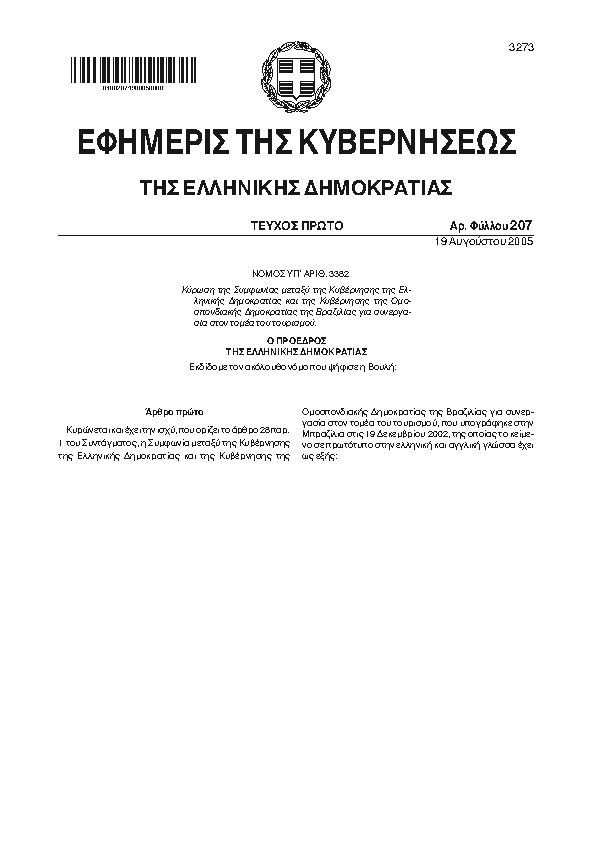 ΚΥΡΩΣΗ ΤΗΣ ΣΥΜΦΩΝΙΑΣ ΜΕΤΑΞΥ ΤΗΣ ΚΥΒΕΡΝΗΣΗΣ ΤΗΣ ΕΛΛΗΝΙΚΗΣ ΔΗΜΟΚΡΑΤΙΑΣ ΚΑΙ ΤΗΣ ΚΥΒΕΡΝΗΣΗΣ ΤΗΣ ΟΜΟΣΠΟΝΔΙΑΚΗΣ ΔΗΜΟΚΡΑΤΙΑΣ ΤΗΣ ΒΡΑΖΙΛΙΑΣ ΓΙΑ ΣΥΝΕΡΓΑΣΙΑ ΣΤΟΝ ΤΟΜΕΑ ΤΟΥ ΤΟΥΡΙΣΜΟΥ