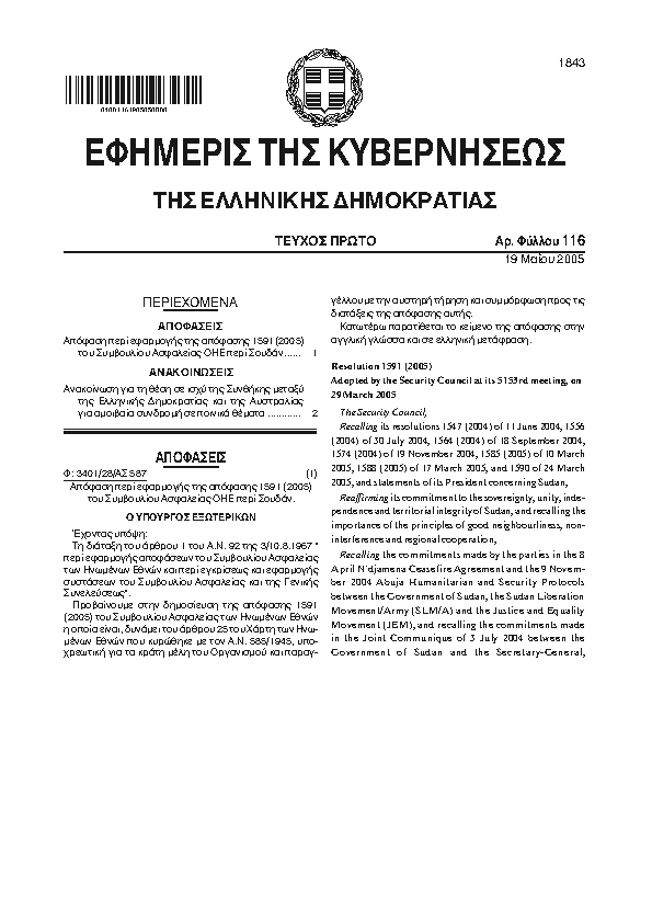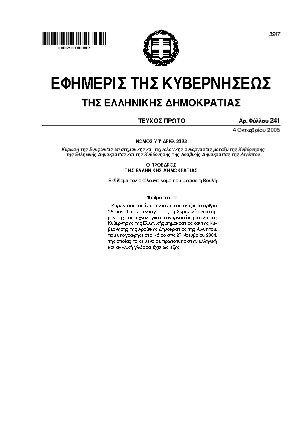 ΚΥΡΩΣΗ ΤΗΣ ΣΥΜΦΩΝΙΑΣ ΕΠΙΣΤΗΜΟΝΙΚΗΣ ΚΑΙ ΤΕΧΝΟΛΟΓΙΚΗΣ ΣΥΝΕΡΓΑΣΙΑΣ ΜΕΤΑΞΥ ΤΗΣ ΚΥΒΕΡΝΗΣΗΣ ΤΗΣ ΕΛΛΗΝΙΚΗΣ ΔΗΜΟΚΡΑΤΙΑΣ ΚΑΙ ΤΗΣ ΚΥΒΕΡΝΗΣΗΣ ΤΗΣ ΑΡΑΒΙΚΗΣ ΔΗΜΟΚΡΑΤΙΑΣ ΤΗΣ ΑΙΓΥΠΤΟΥ