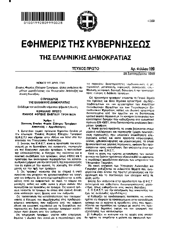 • ΝΟΜΟΣ ΥΠ ΑΡΙΘ. 2741 ΕΝΙΑΙΟΣ ΦΟΡΕΑΣ ΕΛΕΓΧΟΥ ΤΡΟΦΙΜΩΝ ΑΛΛΕΣ ΡΥΘΜΙΣΕΙΣ ΘΕΜΑΤΩΝ ΑΡΜΟΔΙΟΤΗΤΑΣ ΤΟΥ ΥΠΟΥΡΓ. ΑΝΑΠΤΥΞΗΣ ΚΑΙ ΛΟΙΠΕΣ ΔΙΑΤΑΞΕΙΣ