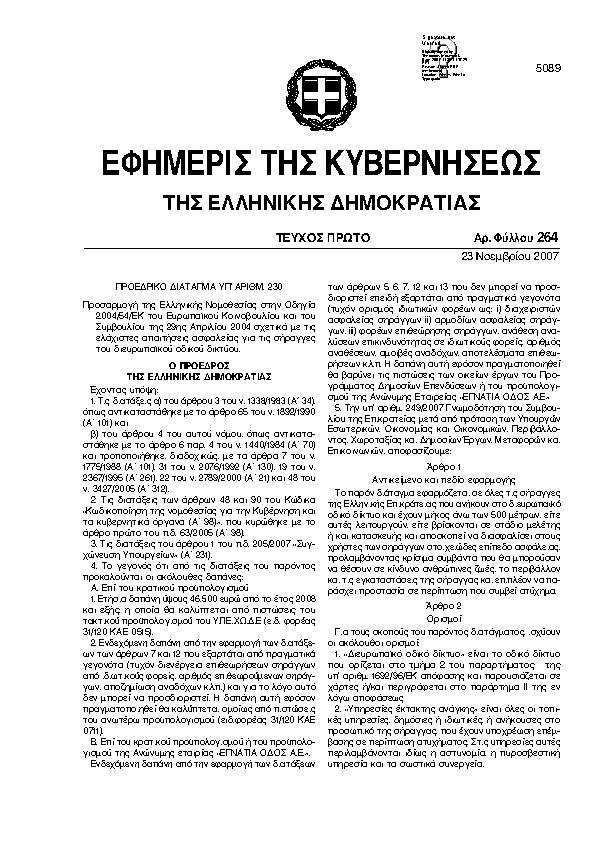 ΠΡΟΣΑΡΜΟΓΗ ΤΗΣ ΕΛΛΗΝΙΚΗΣ ΝΟΜΟΘΕΣΙΑΣ ΣΤΗΝ ΟΔΗΓΙΑ 2004/54/ΕΚ ΤΟΥ ΕΥΡΩΠΑΙΚΟΥ ΚΟΙΝΟΒΟΥΛΙΟΥ ΚΑΙ ΤΟΥ ΣΥΜΒΟΥΛΙΟΥ ΤΗΣ 29ΗΣ ΑΠΡΙΛΙΟΥ 2004 ΣΧΕΤΙΚΑ ΜΕ ΤΙΣ ΕΛΑΧΙΣΤΕΣ ΑΠΑΙΤΗΣΕΙΣ ΑΣΦΑΛΕΙΑΣ ΓΙΑ ΤΙΣ ΣΗΡΑΓΓΕΣ ΤΟΥ ΔΙΕΥΡΩΠΑΙΚΟΥ ΟΔΙΚΟΥ ΔΙΚΤΥΟΥ.