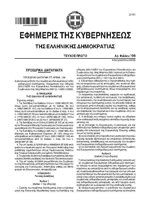 • ΔΙΑΛΕΙΤΟΥΡΓΙΚΟΤΗΤΑ ΤΟΥ ΣΥΜΒΑΤΙΚΟΥ ΔΙΕΥΡΩΠΑΪΚΟΥ ΣΙΔΗΡΟΔΡΟΜΙΚΟΥ ΣΥΣΤΗΜΑΤΟΣ: ΕΝΑΡΜΟΝΙΣΗ ΤΗΣ ΟΔΗΓΙΑΣ 2001/16/ΕΚ ΤΟΥ ΕΥΡΩΠΑΪΚΟΥ ΚΟΙΝΟΒΟΥΛΙΟΥ ΚΑΙ ΤΟΥ ΣΥΜΒΟΥΛΙΟΥ ΤΗΣ 19ης ΜΑΡΤΙΟΥ 2001 (L110/20.4.2000)