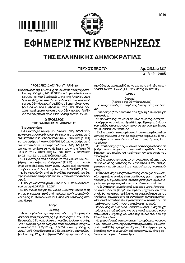 • ΠΡΟΣΑΡΜΟΓΗ ΤΗΣ ΕΛΛΗΝΙΚΗΣ ΝΟΜΟΘΕΣΙΑΣ ΠΡΟΣ ΤΙΣ ΔΙΑΤΑΞΕΙΣ ΤΗΣ ΟΔΗΓΙΑΣ 2001/25/ΕΚ ΤΟΥ ΕΥΡΩΠΑΪΚΟΥ ΚΟΙΝΟΒΟΥΛΙΟΥ ΚΑΙ ΤΟΥ ΣΥΜΒΟΥΛΙΟΥ ΤΗΣ 4ΗΣ ΑΠΡΙΛΙΟΥ 2001 ΓΙΑ ΤΟ ΕΛΑΧΙΣΤΟ ΕΠΙΠΕΔΟ ΕΚΠΑΙΔΕΥΣΗΣ ΤΩΝ ΝΑΥΤΙΚΩΝ ΚΑΙ ΤΗΣ ΟΔΗΓΙΑΣ 2003/103/ΕΚ ΤΟΥ ΕΥΡΩΠΑΪΚΟΥ ΚΟΙΝΟΒΟΥΛΙΟ