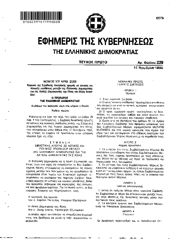• ΚΥΡΩΣΗ ΤΗΣ ΣΥΜΦΩΝΙΑΣ ΔΙΚΑΣΤΙΚΗΣ ΑΡΩΓΗΣ ΣΕ ΑΣΤΙΚΕΣ ΚΑΙ ΠΟΙΝΙΚΕΣ ΥΠΟΘΕΣΕΙΣ ΜΕΤΑΞΥ ΤΗΣ ΕΛΛΗΝΙΚΗΣ ΔΗΜΟΚΡΑΤΙΑΣ ΚΑΙ ΤΗΣ ΛΑΪΚΗΣ ΔΗΜΟΚΡΑΤΙΑΣ ΤΗΣ ΚΙΝΑΣ ΚΑΙ ΑΛΛΕΣ ΔΙΑΤΑΞΕΙΣ