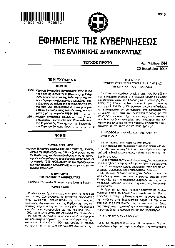 • ΚΥΡΩΣΗ ΜΝΗΜΟΝΙΟΥ ΣΥΝΕΡΓΑΣΙΑΣ ΣΤΟΝ ΤΟΜΕΑ ΤΗΣ ΠΑΙΔΕΙΑΣ ΜΕΤΑΞΥ ΕΛΛΑΔΑΣ - ΚΥΠΡΟΥ ΓΙΑ ΕΚΠΑΙΔΕΥΤΙΚΗ ΣΥΝΕΡΓΑΣΙΑ ΓΙΑ ΤΗΝ ΠΕΡΙΟΔΟ 1993-1996