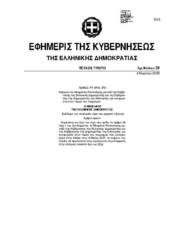ΚΥΡΩΣΗ ΤΟΥ ΜΝΗΜΟΝΙΟΥ ΚΑΤΑΝΟΗΣΗΣ ΜΕΤΑΞΥ ΤΗΣ ΚΥΒΕΡΝΗΣΗΣ ΤΗΣ ΕΛΛΗΝΙΚΗΣ ΔΗΜΟΚΡΑΤΙΑΣ ΚΑΙ ΤΗΣ ΚΥΒΕΡΝΗΣΗΣ ΤΗΣ ΔΗΜΟΚΡΑΤΙΑΣ ΤΗΣ ΙΝΔΟΝΗΣΙΑΣ ΓΙΑ ΣΥΝΕΡΓΑΣΙΑ ΣΤΟΝ ΤΟΜΕΑ ΤΟΥ ΤΟΥΡΙΣΜΟΥ.
