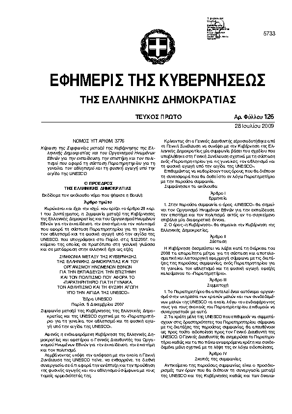ΚΥΡΩΣΗ ΤΗΣ ΣΥΜΦΩΝΙΑΣ ΜΕΤΑΞΥ ΤΗΣ ΚΥΒΕΡΝΗΣΗΣ ΤΗΣ ΕΛΛΗΝΙΚΗΣ ΔΗΜΟΚΡΑΤΙΑΣ ΚΑΙ ΤΟΥ ΟΡΓΑΝΙΣΜΟΥ ΗΝΩΜΕΝΩΝ ΕΘΝΩΝ ΓΙΑ ΤΗΝ ΕΚΠΑΙΔΕΥΣΗ, ΤΗΝ ΕΠΙΣΤΗΜΗ ΚΑΙ ΤΟΝ ΠΟΛΙΤΙΣΜΟ ΠΟΥ ΑΦΟΡΑ ΤΗ ΣΥΣΤΑΣΗ ΠΑΡΑΤΗΡΗΤΗΡΙΟΥ ΓΙΑ ΤΗ ΓΥΝΑΙΚΑ, ΤΟΝ ΑΘΛΗΤΙΣΜΟ ΚΑΙ ΤΗ ΦΥΣΙΚΗ ΑΓΩΓΗ ΥΠΟ ΤΗΝ ΑΙΓΙΔΑ ΤΗΣ UNESCO