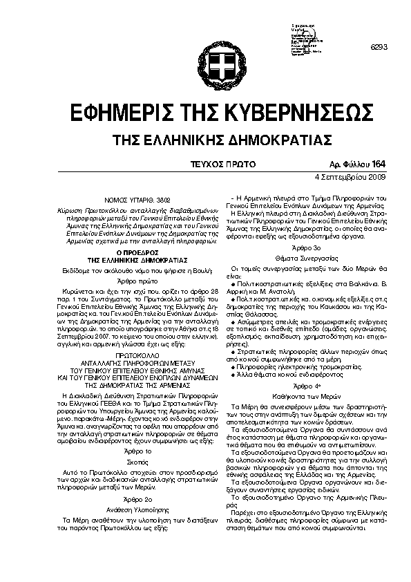 ΚΥΡΩΣΗ ΠΡΩΤΟΚΟΛΛΟΥ ΑΝΤΑΛΛΑΓΗΣ ΔΙΑΒΑΘΜΙΣΜΕΝΩΝ ΠΛΗΡΟΦΟΡΙΩΝ ΜΕΤΑΞΥ ΤΟΥ ΓΕΝΙΚΟΥ ΕΠΙΤΕΛΕΙΟΥ ΕΘΝΙΚΗΣ ΑΜΥΝΑΣ ΤΗΣ ΕΛΛΗΝΙΚΗΣ ΔΗΜΟΚΡΑΤΙΑΣ ΚΑΙ ΤΟΥ ΓΕΝΙΚΟΥ ΕΠΙΤΕΛΕΙΟΥ ΕΝΟΠΛΩΝ ΔΥΝΑΜΕΩΝ ΤΗΣ ΔΗΜΟΚΡΑΤΙΑΣ ΤΗΣ ΑΡΜΕΝΙΑΣ ΣΧΕΤΙΚΑ ΜΕ ΤΗΝ ΑΝΤΑΛΛΑΓΗ ΠΛΗΡΟΦΟΡΙΩΝ