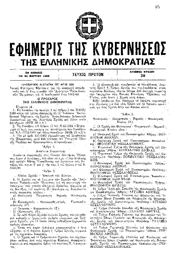 • 'ΕΙΣΑΓΩΓΗ ΣΠΟΥΔΑΣΤΩΝ ΣΤΟ Α'' ΕΤΟΣ ΣΠΟΥΔΩΝ, ΤΩΝ ΑΝΩΤΑΤΩΝ ΚΑΙ ΑΝΩΤΕΡΩΝ ΣΧΟΛΩΝ ΜΕ ΒΑΣΗ ΤΑ ΑΡΘΡΑ 3 ΚΑΙ 5 ΤΟΥ Ν. 1035/80, ΓΙΑ ΤΟ ΑΚΑΔΗΜΑΪΚΟ ΕΤΟΣ 1982-83.'