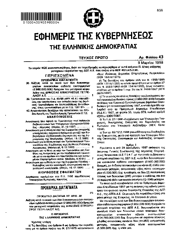 ΑΥΞΗΣΗ ΚΑΤΑ ΤΟ ΠΟΣΟ ΤΩΝ ΔΥΟ ΔΙΣΕΚΑΤΟΜΜΥΡΙΩΝ ΕΝΝΙΑΚΟΣΙΩΝ ΟΓΔΟΝΤΑ ΕΚΑΤΟΜΜΥΡΙΩΝ 2.980.000.000 ΔΡΑΧΜΩΝ ΤΟΥ ΜΕΤΟΧΙΚΟΥ ΚΕΦΑΛΑΙΟΥ ΤΗΣ ΔΗΜΟΣΙΑΣ ΕΠΙΧΕΙΡΗΣΕΩΣ ΠΕΤΡΕΛΑΙΟΥ Α.Ε.