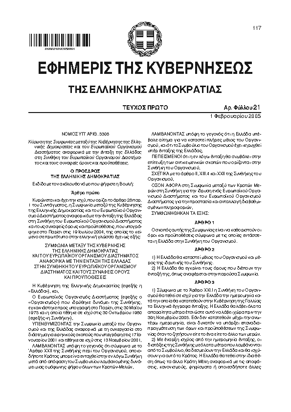 • ΚΥΡΩΣΗ ΤΗΣ ΣΥΜΦΩΝΙΑΣ ΜΕΤΑΞΥ ΤΗΣ ΚΥΒΕΡΝΗΣΗΣ ΤΗΣ ΕΛΛΗΝΙΚΗΣ ΔΗΜΟΚΡΑΤΙΑΣ ΚΑΙ ΤΟΥ ΕΥΡΩΠΑΪΚΟΥ ΟΡΓΑΝΙΣΜΟΥ ΔΙΑΣΤΗΜΑΤΟΣ ΑΝΑΦΟΡΙΚΑ ΜΕ ΤΗΝ ΕΝΤΑΞΗ ΤΗΣ ΕΛΛΑΔΑΣ ΣΤΗ ΣΥΝΘΗΚΗ ΤΟΥ ΕΥΡΩΠΑΪΚΟΥ ΟΡΓΑΝΙΣΜΟΥ ΔΙΑΣΤΗΜΑΤΟΣ ΚΑΙ ΤΟΥΣ ΣΥΝΑΦΕΙΣ ΟΡΟΥΣ ΚΑΙ ΠΡΟΫΠΟΘΕΣΕΙΣ
