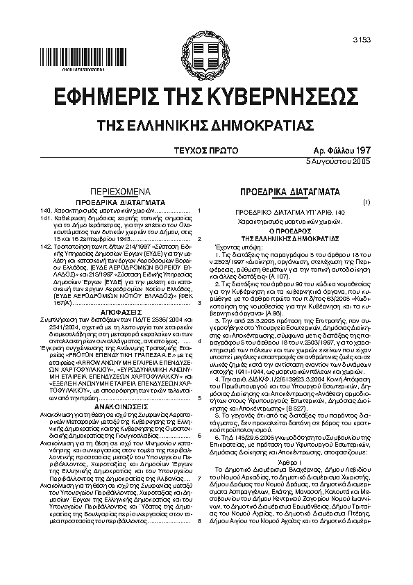 1. ΦΕΚ 197/A, 2005 http://www.et.gr/ Προεδρικό Διάταγμα