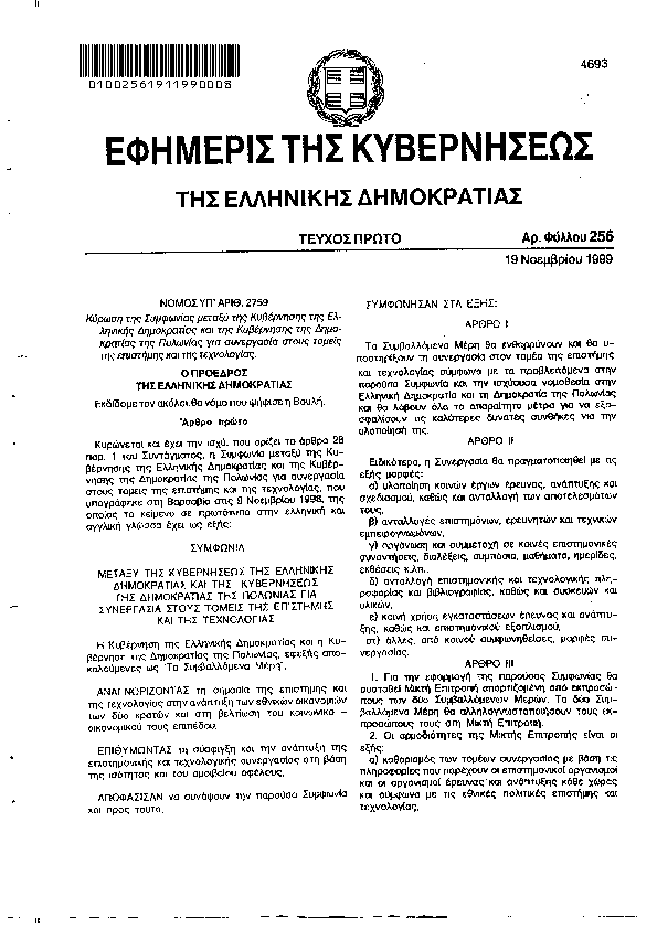 ΚΥΡΩΣΗ ΤΗΣ ΣΥΜΦΩΝΙΑΣ ΜΕΤΑΞΥ ΤΗΣ ΚΥΒΕΡΝΗΣΗΣ ΤΗΣ ΕΛΛ. ΔΗΜΟΚΡΑΤΙΑΣ ΚΑΙ ΤΗΣ ΚΥΒΕΡΝΗΣΗΣ ΤΗΣ ΔΗΜΟΚΡΑΤΙΑΣ ΤΗΣ ΠΟΛΩΝΙΑΣ ΓΙΑ ΣΥΝΕΡΓΑΣΙΑ ΣΤΟΥΣ ΤΟΜΕΙΣ ΤΗΣ ΕΠΙΣΤΗΜΗΣ ΚΑΙ ΤΗΣ ΤΕΧΝΟΛΟΓΙΑΣ