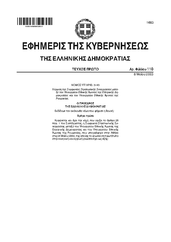 ΚΥΡΩΣΗ ΤΗΣ ΣΥΜΦΩΝΙΑΣ ΣΤΡΑΤΙΩΤΙΚΗΣ ΣΥΝΕΡΓΑΣΙΑΣ ΜΕΤΑΞΥ ΤΟΥ ΥΠΟΥΡΓΕΙΟΥ ΕΘΝΙΚΗΣ ΑΜΥΝΑΣ ΤΗΣ ΕΛΛΗΝΙΚΗΣ ΔΗΜΟΚΡΑΤΙΑΣ ΚΑΙ ΤΟΥ ΥΠΟΥΡΓΕΙΟΥ ΕΘΝΙΚΗΣ ΑΜΥΝΑΣ ΤΗΣ ΡΟΥΜΑΝΙΑΣ