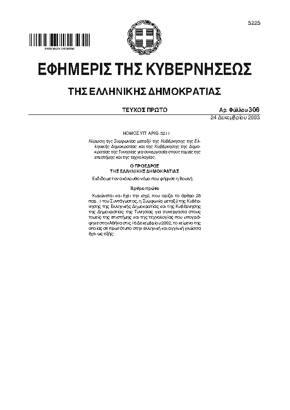 ΚΥΡΩΣΗ ΤΗΣ ΣΥΜΦΩΝΙΑΣ ΜΕΤΑΞΥ ΤΗΣ ΚΥΒΕΡΝΗΣΗΣ ΤΗΣ ΕΛΛΗΝΙΚΗΣ ΔΗΜΟΚΡΑΤΙΑΣ ΚΑΙ ΤΗΣ ΚΥΒΕΡΝΗΣΗΣ ΤΗΣ ΔΗΜΟΚΡΑΤΙΑΣ ΤΗΣ ΤΥΝΗΣΙΑΣ ΓΙΑ ΣΥΝΕΡΓΑΣΙΑ ΣΤΟΥΣ ΤΟΜΕΙΣ ΤΗΣ ΕΠΙΣΤΗΜΗΣ ΚΑΙ ΤΗΣ ΤΕΧΝΟΛΟΓΙΑΣ