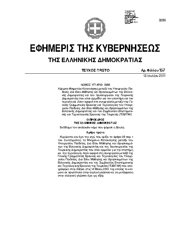 ΚΥΡΩΣΗ ΜΝΗΜΟΝΙΟΥ ΚΑΤΑΝΟΗΣΗΣ ΜΕΤΑΞΥ ΤΟΥ ΥΠΟΥΡΓΕΙΟΥ ΠΑΙΔΕΙΑΣ, ΔΙΑ ΒΙΟΥ ΜΑΘΗΣΗΣ ΚΑΙ ΘΡΗΣΚΕΥΜΑΤΩΝ ΤΗΣ ΕΛΛΗΝΙΚΗΣ ΔΗΜΟΚΡΑΤΙΑΣ ΚΑΙ ΤΟΥ ΥΦΥΠΟΥΡΓΕΙΟΥ ΤΗΣ ΤΟΥΡΚΙΚΗΣ ΔΗΜΟΚΡΑΤΙΑΣ ΠΟΥ ΕΙΝΑΙ ΑΡΜΟΔΙΟ ΓΙΑ ΤΗΝ ΕΠΙΣΤΗΜΗ ΚΑΙ ΤΗΝ ΤΕΧΝΟΛΟΓΙΑ, ΟΣΟΝ ΑΦΟΡΑ ΣΤΗ ΣΥΝΕΡΓΑΣΙΑ ΜΕΤΑΞΥ ΤΗΣ ΓΕΝΙΚΗΣ ΓΡΑΜΜΑΤΕΙΑΣ ΕΡΕΥΝΑΣ ΚΑΙ ΤΕΧΝΟΛΟΓΙΑΣ ΤΟΥ ΥΠΟΥΡΓΕΙΟΥ ΠΑΙΔΕΙΑΣ, ΔΙΑ ΒΙΟΥ ΜΑΘΗΣΗΣ ΚΑΙ ΘΡΗΣΚΕΥΜΑΤΩΝ ΤΗΣ ΕΛΛΗΝΙΚΗΣ ΔΗΜΟΚΡΑΤΙΑΣ ΚΑΙ ΤΟΥ ΣΥΜΒΟΥΛΙΟΥ ΕΠΙΣΤΗΜΟΝΙΚΗΣ ΚΑΙ ΤΕΧΝΟΛΟΓΙΚΗΣ ΕΡΕΥΝΑΣ ΤΗΣ ΤΟΥΡΚΙΑΣ (TUBITAK).