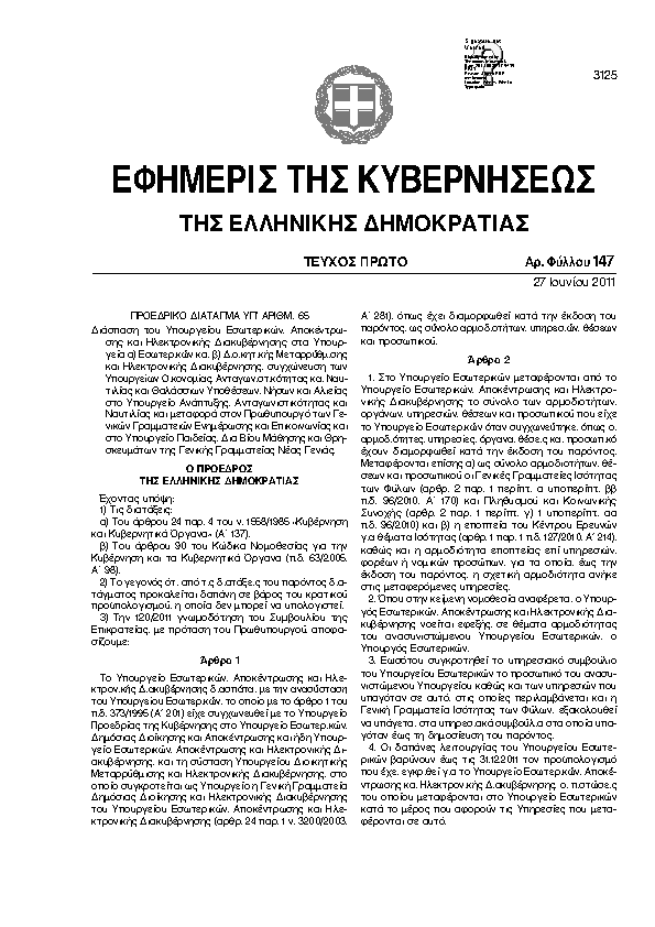 ΔΙΑΣΠΑΣΗ ΤΟΥ ΥΠΟΥΡΓΕΙΟΥ ΕΣΩΤΕΡΙΚΩΝ, ΑΠΟΚΕΝΤΡΩΣΗΣ ΚΑΙ ΗΛΕΚΤΡΟΝΙΚΗΣ ΔΙΑΚΥΒΕΡΝΗΣΗΣ ΣΤΑ ΥΠΟΥΡΓΕΙΑ Α) ΕΣΩΤΕΡΙΚΩΝ ΚΑΙ Β) ΔΙΟΙΚΗΤΙΚΗΣ ΜΕΤΑΡΡΥΘΜΙΣΗΣ ΚΑΙ ΗΛΕΚΤΡΟΝΙΚΗΣ ΔΙΑΚΥΒΕΡΝΗΣΗΣ, ΣΥΓΧΩΝΕΥΣΗ ΤΩΝ ΥΠΟΥΡΓΕΙΩΝ ΟΙΚΟΝΟΜΙΑΣ, ΑΝΤΑΓΩΝΙΣΤΙΚΟΤΗΤΑΣ ΚΑΙ ΝΑΥΤΙΛΙΑΣ ΚΑΙ ΘΑΛΑΣΣΙΩΝ ΥΠΟΘΕΣΕΩΝ, ΝΗΣΩΝ ΚΑΙ ΑΛΙΕΙΑΣ ΣΤΟ ΥΠΟΥΡΓΕΙΟ ΑΝΑΠΤΥΞΗΣ, ΑΝΤΑΓΩΝΙΣΤΙΚΟΤΗΤΑΣ ΚΑΙ ΝΑΥΤΙΛΙΑΣ ΚΑΙ ΜΕΤΑΦΟΡΑ ΣΤΟΝ ΠΡΩΘΥΠΟΥΡΓΟ ΤΩΝ ΓΕΝΙΚΩΝ ΓΡΑΜΜΑΤΕΙΩΝ ΕΝΗΜΕΡΩΣΗΣ ΚΑΙ ΕΠΙΚΟΙΝΩΝΙΑΣ ΚΑΙ ΣΤΟ ΥΠΟΥΡΓΕΙΟ ΠΑΙΔΕΙΑΣ, ΔΙΑ ΒΙΟΥ ΜΑΘΗΣΗΣ ΚΑΙ ΘΡΗΣΚΕΥΜΑΤΩΝ ΤΗΣ ΓΕΝΙΚΗΣ ΓΡΑΜΜΑΤΕΙΑΣ ΝΕΑΣ ΓΕΝΙΑΣ.