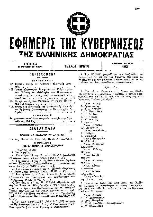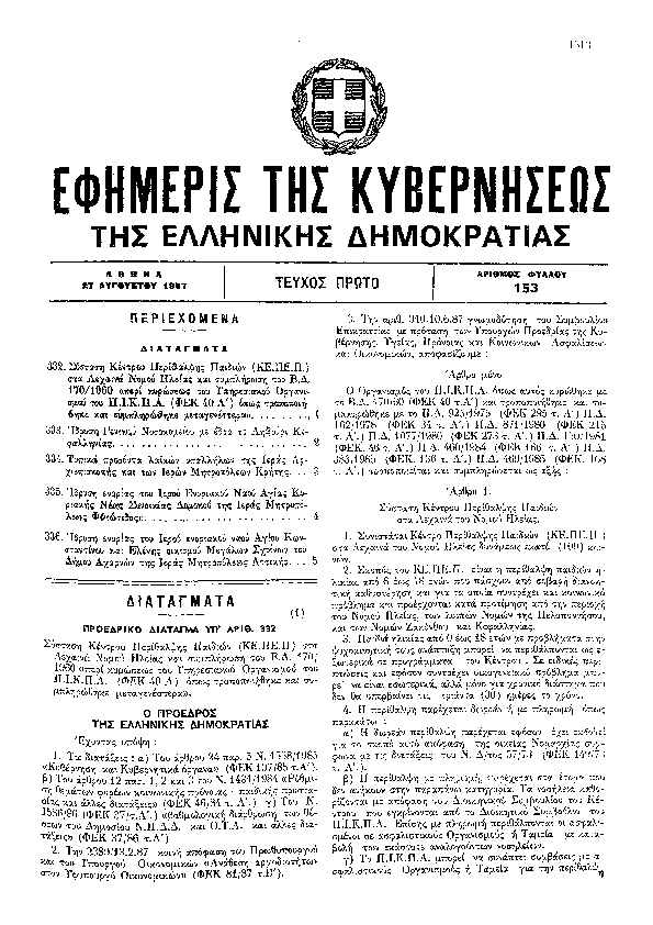 'ΣΥΣΤΑΣΗ ΚΕΝΤΡΟΥ ΠΕΡΙΘΑΛΨΗΣ ΠΑΙΔΙΩΝ (ΚΕ.ΠΕ.Π.) ΣΤΑ ΛΕΧΑΙΝΑ ΝΟΜΟΥ ΗΛΕΙΑΣ ΚΑΙ ΣΥΜΠΛΗΡΩΣΗ ΤΟΥ Β.Δ. 170/1960 «ΠΕΡΙ ΚΥΡΩΣΕΩΣ ΤΟΥ ΥΠΗΡΕΣΙΑΚΟΥ ΟΡΓΑΝΙΣΜΟΥ ΤΟΥ Π.Ι.Κ.Π.Α. (ΦΕΚ 40 Α'') ΟΠΩΣ ΤΡΟΠΟΠΟΙΗΘΗΚΕ ΚΑΙ ΣΥΜΠΛΗΡΩΘΗΚΕ ΜΕΤΑΓΕΝΕΣΤΕΡΑ».'