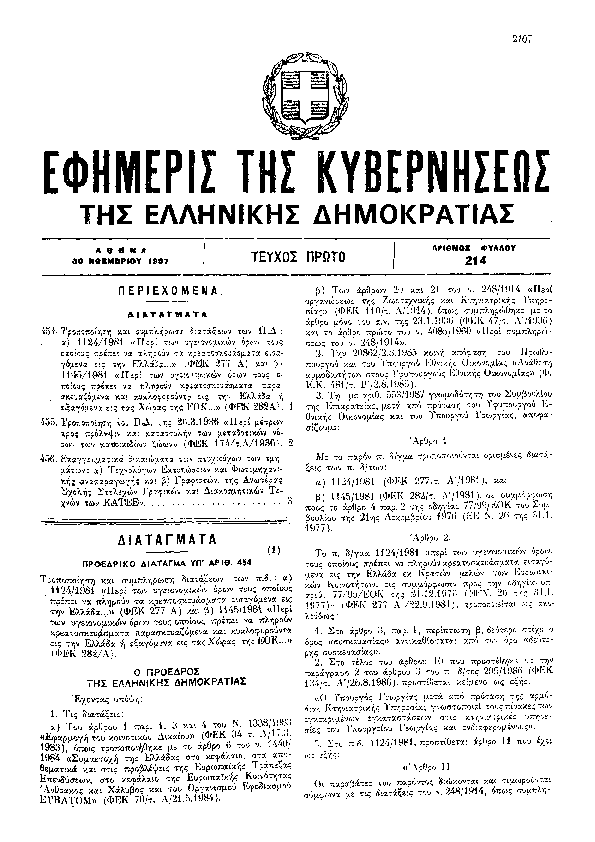 ΤΡΟΠΟΠΟΙΗΣΗ ΚΑΙ ΣΥΜΠΛΗΡΩΣΗ ΔΙΑΤΑΞΕΩΝ ΤΩΝ Π.Δ.: Α) 1124/1981 «ΠΕΡΙ ΤΩΝ ΥΓΕΙΟΝΟΜΙΚΩΝ ΟΡΩΝ ΤΟΥΣ ΟΠΟΙΟΥΣ ΠΡΕΠΕΙ ΝΑ ΠΛΗΡΟΥΝ ΤΑ ΚΡΕΑΤΟΣΚΕΥΑΣΜΑΤΑ ΕΙΣΑΓΟΜΕΝΑ ΕΙΣ ΤΗΝ ΕΛΛΑΔΑ...» (ΦΕΚ 277 Α) ΚΑΙ Β) 1145/1981 «ΠΕΡΙ ΤΩΝ ΥΓΕΙΟΝΟΜΙΚΩΝ ΟΡΩΝ ΤΟΥΣ ΟΠΟΙΟΥΣ ΠΡΕΠΕΙ ΝΑ ΠΛΗΡΟΥΝ ΚΡΕΑΤΟΣΚΕΥΑΣΜΑΤΑ ΠΑΡΑΣΚΕΥΑΖΟΜΕΝΑ ΚΑΙ ΚΥΚΛΟΦΟΡΟΥΝΤΑ ΕΙΣ ΤΗΝ ΕΛΛΑΔΑ Η ΕΞΑΓΟΜΕΝΑ ΕΙΣ ΤΑΣ ΧΩΡΑΣ ΤΗΣ ΕΟΚ...» (ΦΕΚ 282Α).