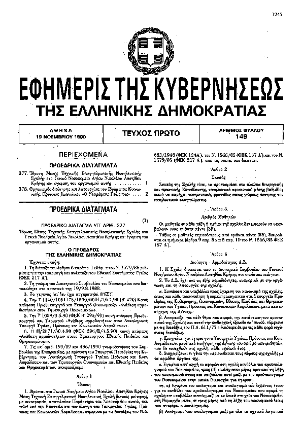 • ΙΔΡΥΣΗ ΜΕΣΗΣ ΤΕΧΝΙΚΗΣ ΕΠΑΓΓΕΛΜΑΤΙΚΗΣ ΝΟΣΗΛΕΥΤΙΚΗΣ ΣΧΟΛΗΣ ΣΤΟ ΓΕΝΙΚΟ ΝΟΣΟΚΟΜΕΙΟ ΑΓΙΟΥ ΝΙΚΟΛΑΟΥ ΛΑΣΗΘΙΟΥ ΚΡΗΤΗΣ ΚΑΙ ΕΓΚΡΙΣΗ ΤΟΥ ΟΡΓΑΝΙΣΜΟΥ ΑΥΤΗΣ.