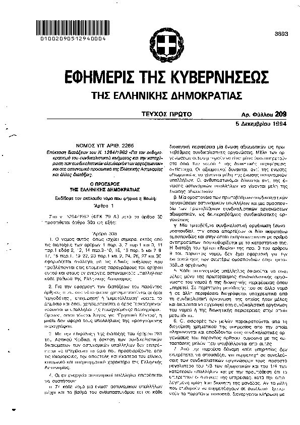 ΕΠΕΚΤΑΣΗ ΔΙΑΤΑΞΕΩΝ ΤΟΥ Ν.1264/1982 ΓΙΑ ΤΟΝ ΕΚΔΗΜΟΚΡΑΤΙΣΜΟ ΤΟΥ ΣΥΝΔΙΚΑΛΙΣΤΙΚΟΥ ΚΙΝΗΜΑΤΟΣ ΚΑΙ ΤΗΝ ΚΑΤΟΧΥΡΩΣΗ ΤΩΝ ΣΥΝΔΙΚΑΛΙΣΤΙΚΩΝ ΕΛΕΥΘΕΡΙΩΝ ΤΩΝ ΕΡΓΑΖΟΜΕΝΩΝ ΚΑΙ ΣΤΟ ΑΣΤΥΝΟΜΙΚΟ ΠΡΟΣΩΠΙΚΟ ΤΗΣ ΕΛΛΗΝΙΚΗΣ ΑΣΤΥΝΟΜΙΑΣ ΚΑΙ ΑΛΛΕΣ ΔΙΑΤΑΞΕΙΣ