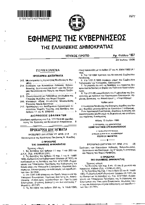 9. ΦΕΚ 167/A, 1996 http://www.et.gr/ Προεδρικό Διάταγμα