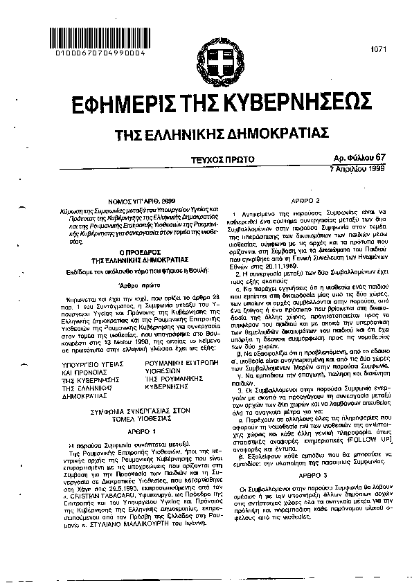 ΚΥΡΩΣΗ ΤΗΣ ΣΥΜΦΩΝΙΑΣ ΜΕΤΑΞΥ ΤΟΥ ΥΠΟΥΡΓΕΙΟΥ ΥΓΕΙΑΣ ΠΡΟΝΟΙΑΣ ΤΗΣ ΚΥΒΕΡΝΗΣΗ ΤΗΣ ΕΛΛ. ΔΗΜΟΚΡΑΤΙΑΣ ΚΑΙ ΤΗΣ ΡΟΥΜΑΝΙΚΗΣ ΕΠΙΤΡΟΠΗΣ ΥΙΟΘΕΣΙΩΝ ΤΗΣ ΡΟΥΜΑΝΙΚΗΣ ΚΥΒΕΡΝΗΣΗΣ ΓΙΑ ΣΥΝΕΡΓΑΣΙΑ ΣΤΟΝ ΤΟΜΕΑ ΤΗΝ ΥΙΟΘΕΣΙΑΣ (Ν. 2699)
