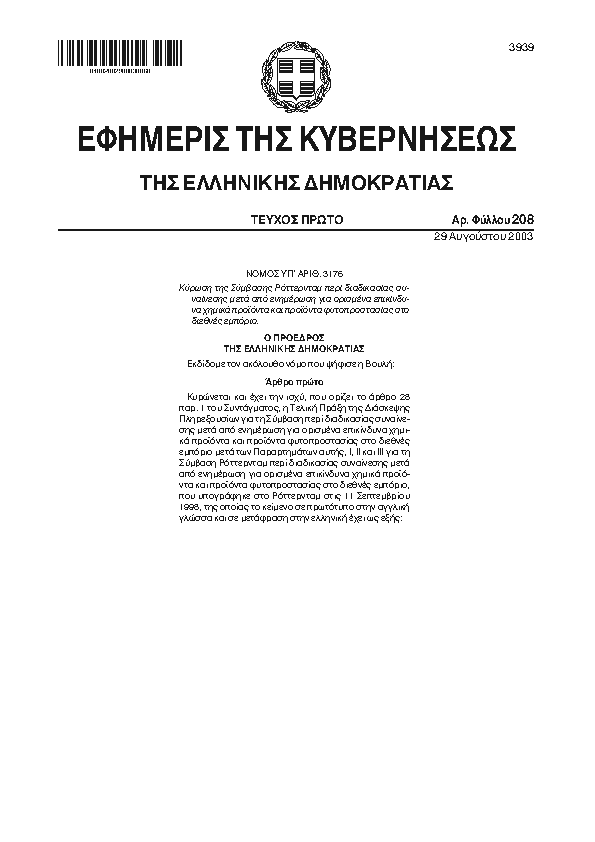 ΚΥΡΩΣΗ ΤΗΣ ΣΥΜΒΑΣΗΣ ΡΟΤΤΕΡΝΤΑΜ ΠΕΡΙ ΔΙΑΔΙΚΑΣΙΑΣ ΣΥΝΑΙΝΕΣΗΣ ΜΕΤΑ ΑΠΟ ΕΝΗΜΕΡΩΣΗ ΓΙΑ ΟΡΙΣΜΕΝΑ ΕΠΙΚΙΝΔΥΝΑ ΧΗΜΙΚΑ ΠΡΟΪΟΝΤΑ ΦΥΤΟΠΡΟΣΤΑΣΙΑΣ ΣΤΟ ΔΙΕΘΝΕΣ ΕΜΠΟΡΙΟ