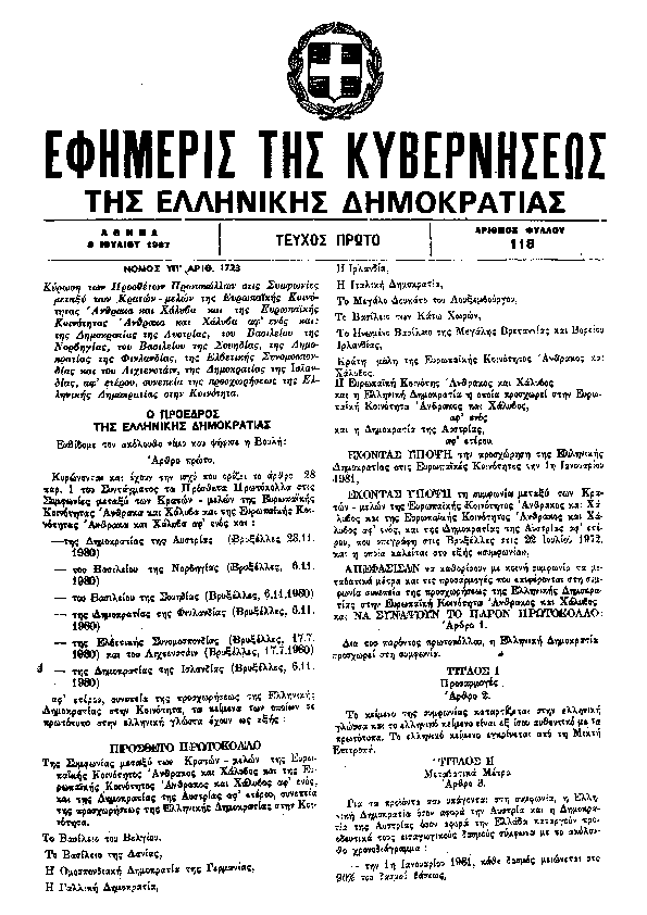 'ΚΥΡΩΣΗ ΤΩΝ ΠΡΟΣΘΕΤΩΝ ΠΡΩΤΟΚΟΛΛΩΝ ΣΤΙΣ ΣΥΜΦΩΝΙΕΣ ΜΕΤΑΞΥ ΤΩΝ ΚΡΑΤΩΝ-ΜΕΛΩΝ ΤΗΣ ΕΥΡΩΠΑΪΚΗΣ ΚΟΙΝΟΤΗΤΑΣ ΑΝΘΡΑΚΑ ΚΑΙ ΧΑΛΥΒΑ ΚΑΙ ΤΗΣ ΕΥΡΩΠΑΪΚΗΣ ΚΟΙΝΟΤΗΤΑΣ ΑΝΘΡΑΚΑ ΚΑΙ ΧΑΛΥΒΑ ΑΦ'' ΕΝΟΣ ΚΑΙ ΤΗΣ ΔΗΜΟΚΡΑΤΙΑΣ ΤΗΣ ΑΥΣΤΡΙΑΣ, ΤΟΥ ΒΑΣΙΛΕΙΟΥ ΤΗΣ ΝΟΡΒΗΓΙΑΣ, ΤΟΥ ΒΑΣΙΛΕΙΟΥ ΤΗΣ ΣΟΥΗΔΙΑΣ, ΤΗΣ ΔΗΜΟΚΡΑΤΙΑΣ ΤΗΣ ΦΙΝΛΑΝΔΙΑΣ, ΤΗΣ ΕΛΒΕΤΙΚΗΣ ΣΥΝΟΜΟΣΠΟΝΔΙΑΣ ΚΑΙ ΤΟΥ ΛΙΧΤΕΝΣΤΑΙΝ, ΤΗΣ ΔΗΜΟΚΡΑΤΙΑΣ ΤΗΣ ΙΣΛΑΝΔΙΑΣ, ΑΦ'' ΕΤΕΡΟΥ, ΣΥΝΕΠΕΙΑ ΤΗΣ ΠΡΟΣΧΩΡΗΣΕΩΣ ΤΗΣ ΕΛΛΗΝΙΚΗΣ ΔΗΜΟΚΡΑΤΙΑΣ ΣΤΗΝ ΚΟΙΝΟΤΗΤΑ.'