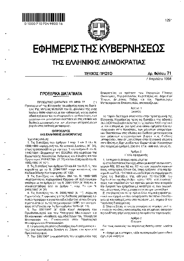ΠΡΟΣΑΡΜΟΓΗ ΤΗΣ ΕΛΛΗΝ.ΝΟΜΟΘΕΣΙΑΣ ΠΡΟΣ ΤΙΣ Δ/ΞΕΙΣ ΟΔΗΓΙΑΣ 96/53/ΕΚ ΣΥΜΒΟΥΛΙΟΥ ΤΗΣ 25ΗΣ/7/96 ΣΧΕΤΙΚΑ ΜΕ ΤΟΝ ΚΑΘΟΡΙΣΜΟ ΓΙΑ ΟΡΙΣΜΕΝΑ ΟΔΙΚΑ ΟΧΗΜΑΤΑ ΠΟΥ ΚΥΚΛΟΦΟΡΟΥΝ ΣΤΗΝ ΚΟΙΝΟΤΗΤΑ ΤΩΝ ΜΕΓΙΣΤΩΝ ΕΠΙΤΡΕΠΟΜΕΝΩΝ ΔΙΑΣΤΑΣΕΩΝ ΣΤΙΣ ΕΘΝΙΚΕΣ & ΔΙΕΘΝΕΙΣ ΜΕΤΑΦΟΡΕΣ ...