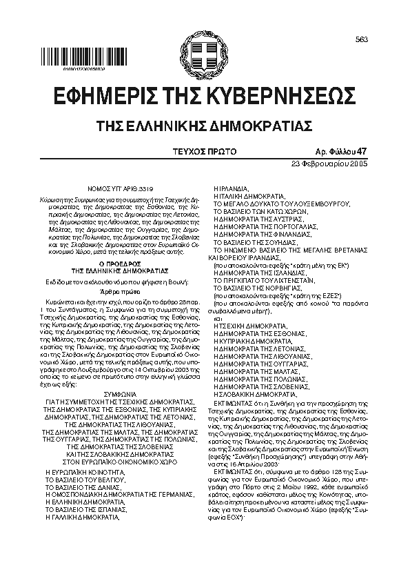 ΚΥΡΩΣΗ ΤΗΣ ΣΥΜΦΩΝΙΑΣ ΓΙΑ ΤΗ ΣΥΜΜΕΤΟΧΗ ΤΗΣ ΤΣΕΧΙΚΗΣ ΔΗΜΟΚΡΑΤΙΑΣ, ΤΗΣ ΔΗΜΟΚΡΑΤΙΑΣ ΤΗΣ ΕΣΘΟΝΙΑΣ, ΤΗΣ ΚΥΠΡΙΑΚΗΣ ΔΗΜΟΚΡΑΤΙΑΣ, ΤΗΣ ΔΗΜΟΚΡΑΤΙΑΣ ΤΗΣ ΛΕΤΟΝΙΑΣ, ΤΗΣ ΔΗΜΟΚΡΑΤΙΑΣ ΤΗΣ ΛΙΘΟΥΑΝΙΑΣ, ΤΗΣ ΔΗΜΟΚΡΑΤΙΑΣ ΤΗΣ ΜΑΛΤΑΣ, ΤΗΣ ΔΗΜΟΚΡΑΤΙΑΣ ΤΗΣ ΟΥΓΓΑΡΙΑΣ, ΤΗΣ ΔΗΜΟΚΡΑΤΙΑΣ ΤΗ ΣΠΟΛΩΝΙΑΣ, ΤΗΣ ΔΗΜΟΚΡΑΤΙΑΣ ΤΗΣ ΣΛΟΒΕΝΙΑΣ ΚΑΙ ΤΗΣ ΣΛΟΒΑΚΙΚΗΣ ΔΗΜΟΚΡΑΤΙΑΣ ΣΤΟΝ ΕΥΡΩΠΑΪΚΟ ΟΙΚΟΝΟΜΙΚΟ ΧΩΡΟ, ΜΕΤΑ ΤΗΣ ΤΕΛΙΚΗΣ ΠΡΑΞΕΩΣ ΑΥΤΗΣ.