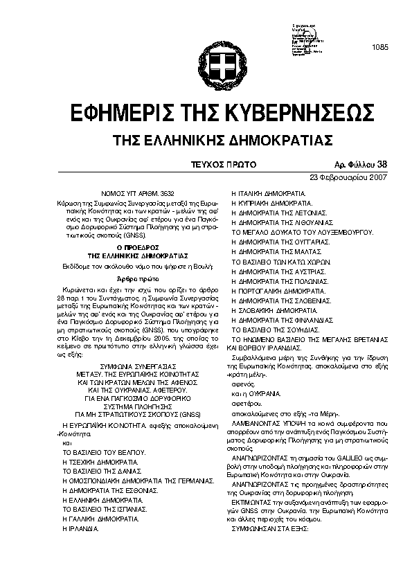 'ΚΥΡΩΣΗ ΤΗΣ ΣΥΜΦΩΝΙΑΣ ΣΥΝΕΡΓΑΣΙΑΣ ΜΕΤΑΞΥ ΤΗΣ ΕΥΡΩΠΑΙΚΗΣ ΚΟΙΝΟΤΗΤΑΣ ΚΑΙ ΤΩΝ ΚΡΑΤΩΝ - ΜΕΛΩΝ ΤΗΣ ΑΦ'' ΕΝΟΣ ΚΑΙ ΤΗΣ ΟΥΚΡΑΝΙΑΣ ΑΦ'' ΕΤΕΡΟΥ ΓΙΑ ΕΝΑ ΠΑΓΚΟΣΜΙΟ ΔΟΡΥΦΟΡΙΚΟ ΣΥΣΤΗΜΑ ΠΛΟΗΓΗΣΗΣ ΓΙΑ ΜΗ ΣΤΡΑΤΙΩΤΙΚΟΥΣ ΣΚΟΠΟΥΣ (GNSS).'