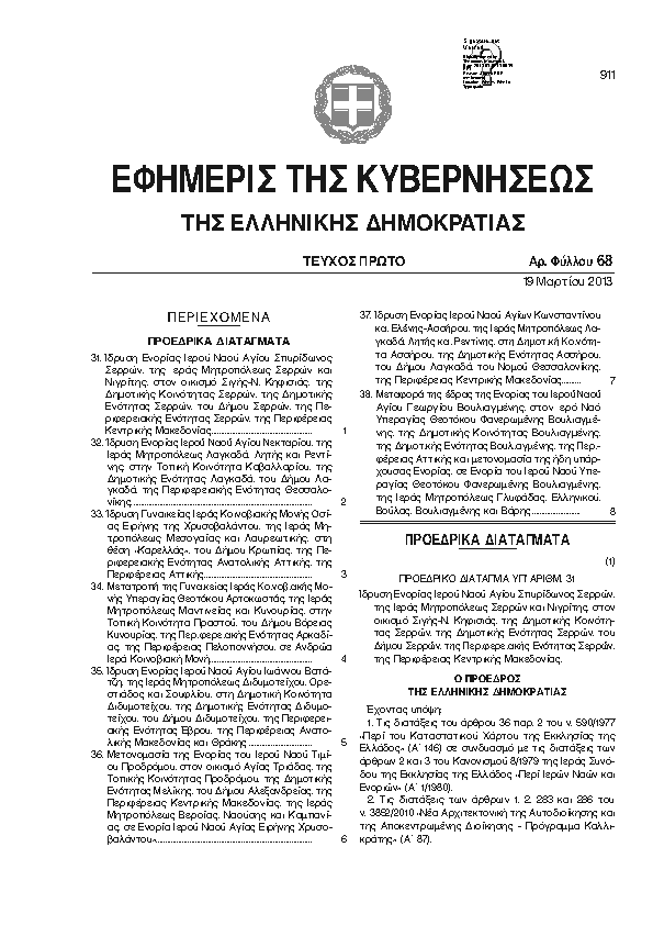 ΙΔΡΥΣΗ ΕΝΟΡΙΑΣ ΙΕΡΟΥ ΝΑΟΥ ΑΓΙΟΥ ΣΠΥΡΙΔΩΝΟΣ ΣΕΡΡΩΝ, ΤΗΣ ΙΕΡΑΣ ΜΗΤΡΟΠΟΛΕΩΣ ΣΕΡΡΩΝ ΚΑΙ ΝΙΓΡΙΤΗΣ, ΣΤΟΝ ΟΙΚΙΣΜΟ ΣΙΓΗΣ-Ν ΚΗΦΙΣΙΑΣ, ΤΗΣ ΔΗΜΟΤΙΚΗΣ ΚΟΙΝΟΤΗΤΑΣ ΣΕΡΡΩΝ, ΤΗΣ ΔΗΜΟΤΙΚΗΣ ΕΝΟΤΗΤΑΣ ΣΕΡΡΩΝ, ΤΟΥ ΔΗΜΟΥ ΣΕΡΡΩΝ, ΤΗΣ ΠΕΡΙΦΕΡΕΙΑΚΗΣ ΕΝΟΤΗΤΑΣ ΣΕΡΡΩΝ, ΤΗΣ ΠΕΡΙΦΕΡΕΙΑΣ ΚΕΝΤΡΙΚΗΣ ΜΑΚΕΔΟΝΙΑΣ