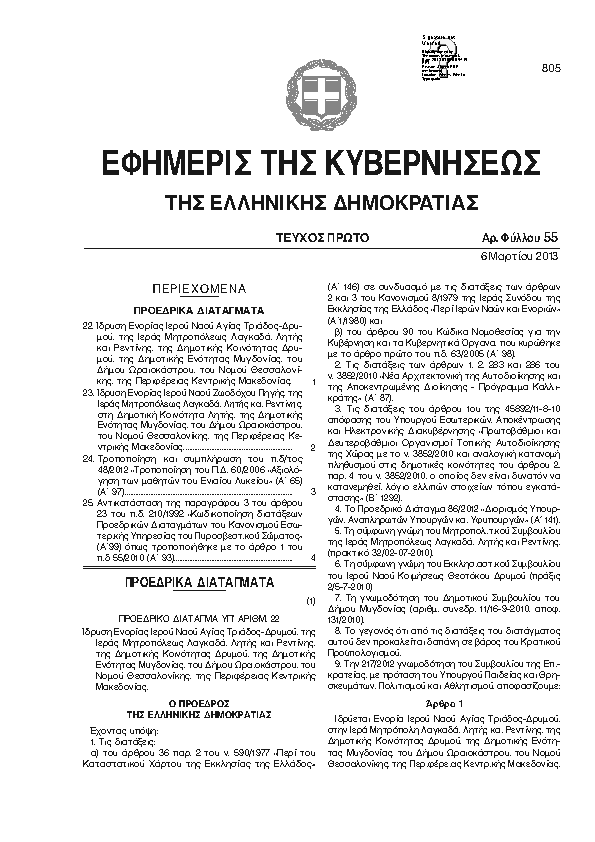 ΙΔΡΥΣΗ ΕΝΟΡΙΑΣ ΙΕΡΟΥ ΝΑΟΥ ΑΓΙΑΣ ΤΡΙΑΔΟΣ-ΔΡΥΜΟΥ, ΤΗΣ ΙΕΡΑΣ ΜΗΤΡΟΠΟΛΕΩΣ ΛΑΓΚΑΔΑ, ΛΗΤΗΣ ΚΑΙ ΡΕΝΤΙΝΗΣ, ΤΗΣ ΔΗΜΟΤΙΚΗΣ ΚΟΙΝΟΤΗΤΑΣ ΔΡΥΜΟΥ, ΤΗΣ ΔΗΜΟΤΙΚΗΣ ΕΝΟΤΗΤΑΣ ΜΥΓΔΟΝΙΑΣ, ΤΟΥ ΔΗΜΟΥ ΩΡΑΙΟΚΑΣΤΡΟΥ, ΤΟΥ ΝΟΜΟΥ ΘΕΣΣΑΛΟΝΙΚΗΣ, ΤΗΣ ΠΕΡΙΦΕΡΕΙΑΣ ΚΕΝΤΡΙΚΗΣ ΜΑΚΕΔΟΝΙΑΣ