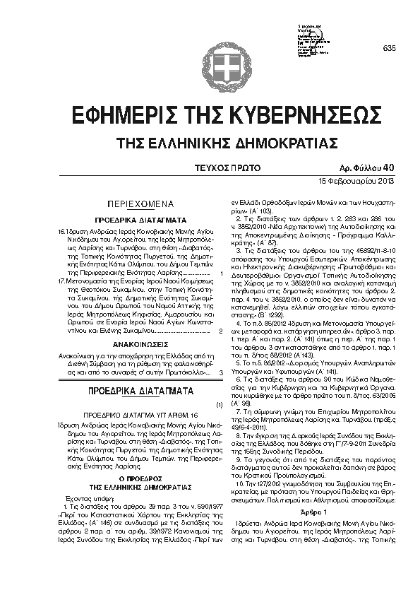 ΙΔΡΥΣΗ ΑΝΔΡΩΑΣ ΙΕΡΑΣ ΚΟΙΝΟΒΙΑΚΗΣ ΜΟΝΗΣ ΑΓΙΟΥ ΝΙΚΟΔΗΜΟΥ ΤΟΥ ΑΓΙΟΡΕΙΤΟΥ, ΤΗΣ ΙΕΡΑΣ ΜΗΤΡΟΠΟΛΕΩΣ ΛΑΡΙΣΗΣ ΚΑΙ ΤΥΡΝΑΒΟΥ, ΣΤΗ ΘΕΣΗ «ΔΙΑΒΑΤΟΣ», ΤΗΣ ΤΟΠΙΚΗΣ ΚΟΙΝΟΤΗΤΑΣ ΠΥΡΓΕΤΟΥ, ΤΗΣ ΔΗΜΟΤΙΚΗΣ ΕΝΟΤΗΤΑΣ ΚΑΤΩ ΟΛΥΜΠΟΥ, ΤΟΥ ΔΗΜΟΥ ΤΕΜΠΩΝ, ΤΗΣ ΠΕΡΙΦΕΡΕΙΑΚΗΣ ΕΝΟΤΗΤΑΣ ΛΑΡΙΣΗΣ.