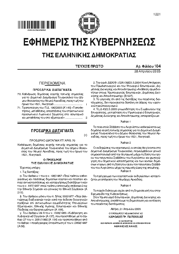 • ΚΑΘΙΕΡΩΣΗ ΔΗΜΟΣΙΑΣ ΕΟΡΤΗΣ ΤΟΠΙΚΗΣ ΣΗΜΑΣΙΑΣ ΓΙΑ ΤΟ ΔΗΜΟΤΙΚΟ ΔΙΑΜΕΡΙΣΜΑ ΤΟΥΡΚΟΛΕΚΑ ΤΟΥ ΔΗΜΟΥ ΦΑΛΑΙΣΙΑΣ ΤΟΥ ΝΟΜΟΥ ΑΡΚΑΔΙΑΣ ΠΡΟΣ ΤΙΜΗ ΤΟΥ ΗΡΩΑ ΤΟΥ 1821 ΝΙΚΗΤΑΡΑ