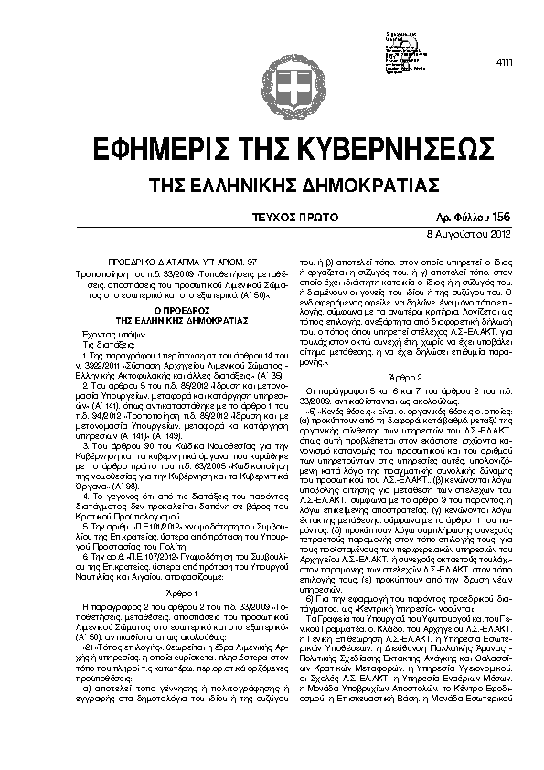 • ΤΡΟΠΟΠΟΙΗΣΗ ΤΟΥ Π.Δ. 33/2009 «ΤΟΠΟΘΕΤΗΣΕΙΣ, ΜΕΤΑΘΕΣΕΙΣ, ΑΠΟΣΠΑΣΕΙΣ ΤΟΥ ΠΡΟΣΩΠΙΚΟΥ ΛΙΜΕΝΙΚΟΥ ΣΩΜΑΤΟΣ ΣΤΟ ΕΣΩΤΕΡΙΚΟ ΚΑΙ ΣΤΟ ΕΞΩΤΕΡΙΚΟ» (Α΄50).