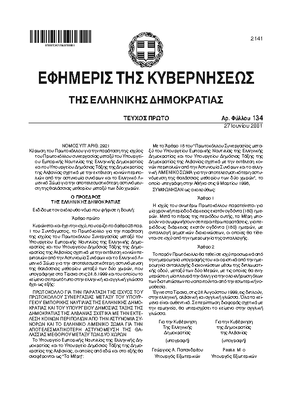 • ΚΥΡΩΣΗ ΤΟΥ ΠΡΩΤΟΚΟΛΛΟΥ ΓΙΑ ΤΗΝ ΠΑΡΑΤΑΣΗ ΤΗΣ ΙΣΧΥΟΣ ΤΟΥ ΠΡΩΤΟΚΟΛΛΟΥ ΣΥΝΕΡΓΑΣΙΑΣ ΜΕΤΑΞΥ ΤΟΥ ΥΠΟΥΡΓΕΙΟΥ ΕΜΠΟΡΙΚΗΣ ΝΑΥΤΙΛΙΑΣ ΤΗΣ ΕΛΛΗΝΙΚΗΣ ΔΗΜΟΚΡΑΤΙΑΣ ΚΑΙ ΤΟΥ ΥΠΟΥΡΓΕΙΟΥ ΔΗΜΟΣΙΑΣ ΤΑΞΗΣ ΤΗΣ ΔΗΜΟΚΡΑΤΙΑΣ ΤΗΣ ΑΛΒΑΝΙΑΣ ΣΧΕΤΙΚΑ ΜΕ ΤΗΝ ΕΚΤΕΛΕΣΗ ΚΟΙΝΩΝ ΠΕΡΙΠΟΛΙΩΝ ΑΠΟ ΤΗΝ ΑΣΤΥΝΟΜΙΑ ΣΥΝΟΡΩΝ ΚΑΙ ΤΟ ΕΛΛΗΝΙΚΟ ΛΙΜΕΝΙΚΟ ΣΩΜΑ ΓΙΑ ΤΗΝ ΑΠΟΤΕΛΕΣΜΑΤΙΚΟΤΕΡΗ ΑΣΤΥΝΟΜΕΥΣΗ ΤΗΣ ΘΑΛΑΣΣΙΑΣ ΜΕΘΟΡΙΟΥ ΜΕΤΑΞΥ ΤΩΝ ΔΥΟ ΧΩΡΩΝ
