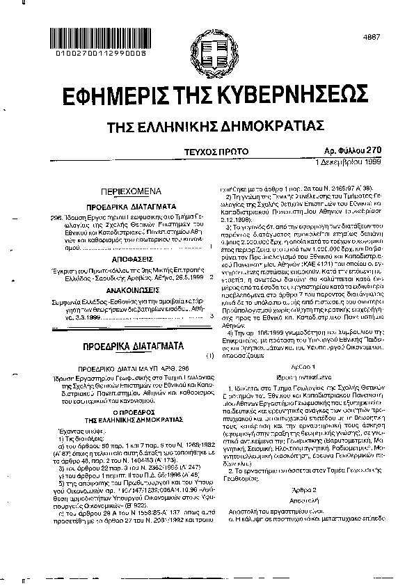 • ΙΔΡΥΣΗ ΕΡΓΑΣΤΗΡΙΟΥ ΓΕΩΦΥΣΙΚΗΣ ΣΤΟ ΤΜΗΜΑ ΓΕΩΛΟΓΙΑΣ ΤΗΣ ΣΧΟΛΗΣ ΘΕΤΙΚΩΝ ΕΠΙΣΤΗΜΩΝ ΤΟΥ ΕΘΝΙΚΟΥ ΚΑΙ ΚΑΠΟΔΙΣΤΡΙΑΚΟΥ ΠΑΝΕΠΙΣΤΗΜΙΟΥ ΑΘΗΝΩΝ ΚΑΙ ΚΑΘΟΡΙΣΜΟΣ ΤΟΥ ΕΣΩΤΕΡΙΚΟΥ ΤΟΥ ΚΑΝΟΝΙΣΜΟΥ