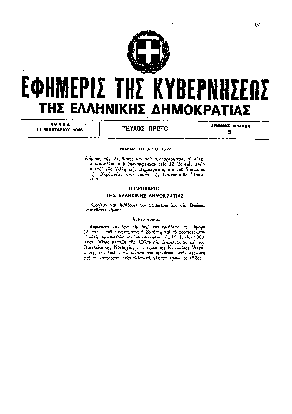 'ΚΥΡΩΣΗ ΤΗΣ ΣΥΜΒΑΣΗΣ ΚΑΙ ΤΟΥ ΠΡΟΣΑΡΤΩΜΕΝΟΥ Σ'' ΑΥΤΗΝ ΠΡΩΤΟΚΟΛΛΟΥ ΠΟΥ ΥΠΟΓΡΑΦΤΗΚΑΝ ΣΤΙΣ 12 ΙΟΥΝΙΟΥ 1980 ΜΕΤΑΞΥ ΤΗΣ ΕΛΛΗΝΙΚΗΣ ΔΗΜΟΚΡΑΤΙΑΣ ΚΑΙ ΤΟΥ ΒΑΣΙΛΕΙΟΥ ΤΗΣ ΝΟΡΒΗΓΙΑΣ ΣΤΟΝ· ΤΟΜΕΑ ΤΗΣ ΚΟΙΝΩΝΙΚΗΣ ΑΣΦΑΛΕΙΑΣ.'