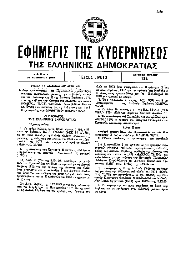 • ΑΠΟΔΟΧΗ ΤΡΟΠΟΠΟΙΗΣΕΩΝ ΤΟΥ ΠΡΩΤΟΚΟΛΛΟΥ 1 «ΔΙΑΤΑΞΕΙΣ ΑΝΑΦΟΡΩΝ ΠΕΡΙΣΤΑΤΙΚΩΝ ΡΥΠΑΝΣΗΣ ΜΕ ΕΠΙΒΛΑΒΕΙΣ ΟΥΣΙΕΣ» ΚΑΙ ΤΟΥ ΠΑΡΑΡΤΗΜΑΤΟΣ ΙΙ ΤΗΣ ΔΙΕΘΝΟΥΣ ΣΥΜΒΑΣΗΣ 1973, «ΓΙΑ ΤΗΝ ΠΡΟΛΗΨΗ ΤΗΣ ΡΥΠΑΝΣΗΣ ΤΗΣ ΘΑΛΑΣΣΑΣ ΑΠΟ ΠΛΟΙΑ» (MARPOL 73/78), ΚΑΘΙΕΡΩΣΗ ΤΥΠΟΥ ΒΙΒΛΙΟΥ ΦΟΡΤΙΟΥ ΚΑΙ ΕΓΧΕΙΡΙΔΙΟΥ ΠΡΟΤΥΠΩΝ ΓΙΑ ΤΙΣ ΔΙΑΔΙΚΑΣΙΕΣ ΚΑΙ ΔΙΑΤΑΞΕΙΣ ΑΠΟΡΡΙΨΗΣ ΣΤΗ ΘΑΛΑΣΣΑ ΥΓΡΩΝ ΕΠΙΒΛΑΒΩΝ ΟΥΣΙΩΝ.