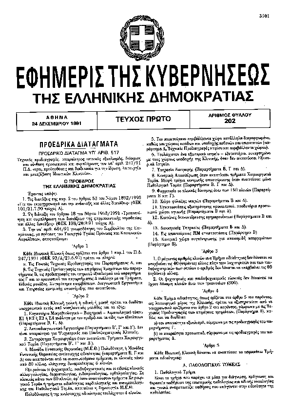 ΤΕΧΝΙΚΕΣ ΠΡΟΔΙΑΓΡΑΦΕΣ, ΑΠΑΡΑΙΤΗΤΟΣ ΙΑΤΡΙΚΟΣ ΕΞΟΠΛΙΣΜΟΣ, ΔΙΑΚΡΙΣΗ ΚΑΙ ΣΥΝΘΕΣΗ ΠΡΟΣΩΠΙΚΟΥ ΚΑΙ ΣΥΜΠΛΗΡΩΣΗ ΤΟΥ ΥΠ ΑΡΙΘ. 247/91 Π.Δ. «ΟΡΟΙ, ΠΡΟΫΠΟΘΕΣΕΙΣ ΚΑΙ ΔΙΑΔΙΚΑΣΙΑ ΓΙΑ ΤΗΝ ΙΔΡΥΣΗ, ΛΕΙΤΟΥΡΓΙΑ ΚΑΙ ΜΕΤΑΒΙΒΑΣΗ ΙΔΙΩΤΙΚΩΝ ΚΛΙΝΙΚΩΝ».